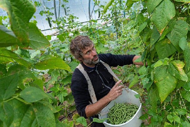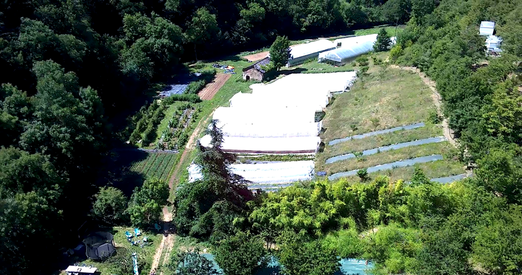 Nous sommes Margot et Mathieu, maraichers Bio au Viala-du-Tarn en fond de vallée. Nous produisons des fruits légumes diversifiés et nous transformons les surplus en confitures. Nous travaillons à deux et nous avons un temps plein saisonnier. Nous avons 2500 m2 de serres sur trois sites différents à une distance de 4 km maximum m où nous ne travaillons pas le sol, uniquement à la Grelinette et Campagnole. Et 2 Ha de plein champ pour les cultures comme patate douce, courge et patate…Notre commercialisation se fait uniquement à Millau.
